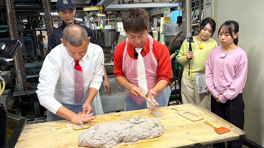 八幡浜市ではじゃこ天作りに挑戦!ホタルジャコという魚をすりつぶしたものを木枠に入れ揚げていくのだが、